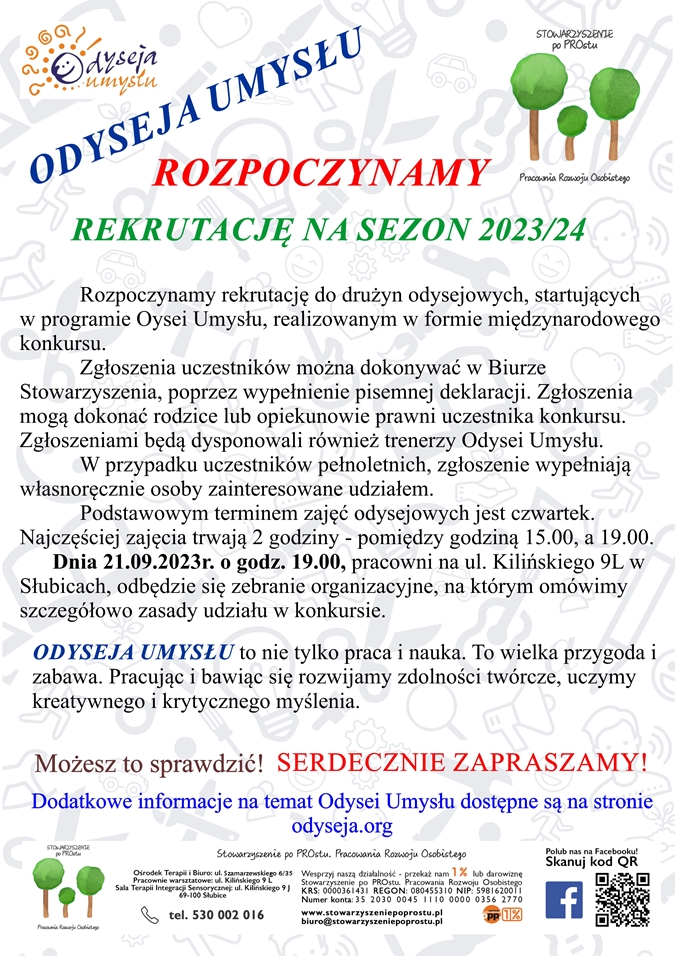 Rozpoczynamy nowy sezon Odysej Umysłu. W czwartek 21.09.2023r. o godzinie 19.00, w pracowni na ul. Kilińskiego 9L w Słubicach, odbędzie się spotkanie organizacyjne poświęcone udziałowi w tym międzynarodowym konkursie. Zapraszamy rodziców / opiekunów prawnych, wraz z chętnymi do udziału w OU. Trenerzy przekażą informacje dotyczące funkcjonowania drużyn odysejowych w bieżącym sezonie oraz przebiegu konkursu. Będzie też można dokonać formalnego zgłoszenia do udziału w konkursie.